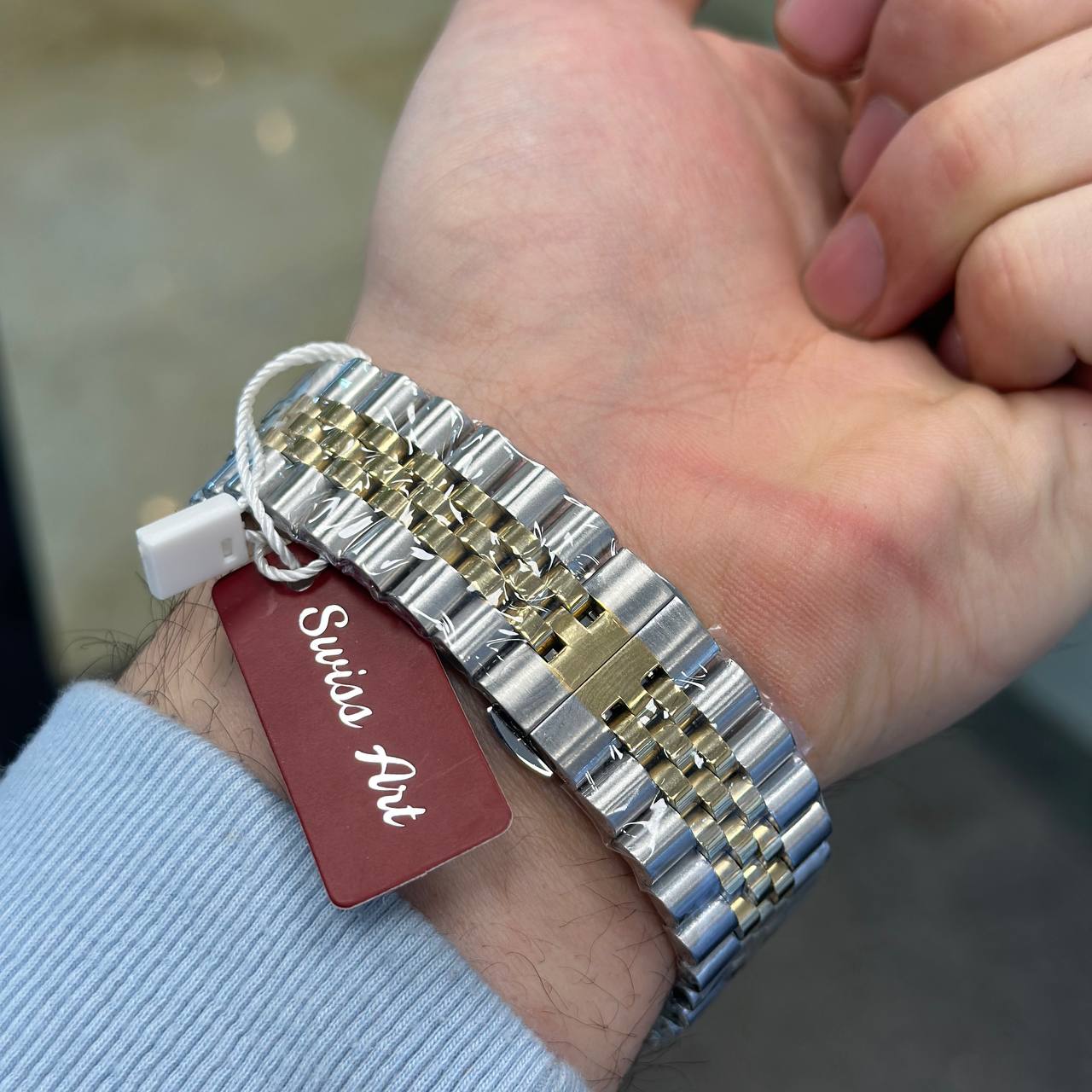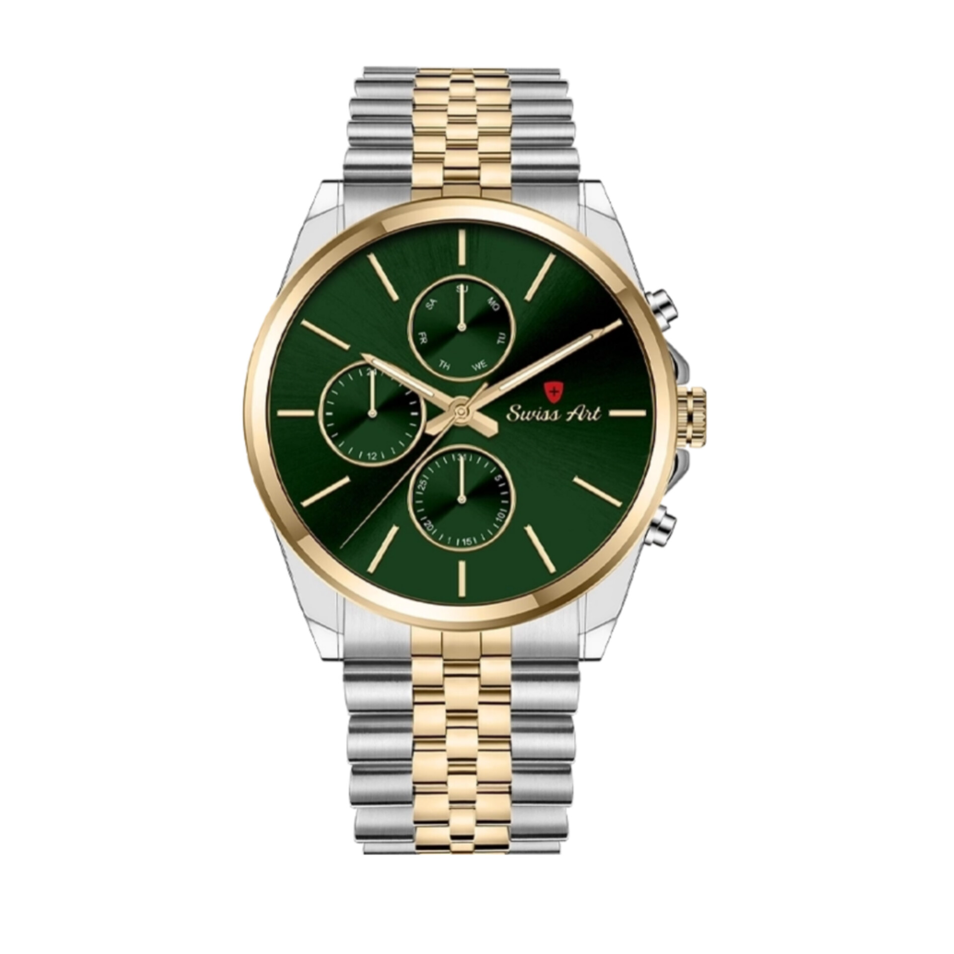 ساعت مردانه سوئیس آرت با طراحی برجسته و ویژگی‌های پیشرفته، انتخابی ایده‌آل برای کسانی است که به دقت، کیفیت و استایل اهمیت می‌دهند. این ساعت با موتور فول دیت ژاپنی، قابلیت نمایش ساعت 24 ساعته، روز شماره هفته و تقویم را به شما می‌دهد که علاوه بر دقت بالا، کاربری راحتی را نیز فراهم می‌کند. طراحی صفحه سبز و ترکیب بند استیل نقره‌ای و طلایی، ظاهری شیک و مدرن به این ساعت بخشیده است. شیشه ضد خش سافایر از آسیب‌ها جلوگیری می‌کند و طول عمر ساعت را تضمین می‌کند. این ساعت ضد آب بوده و در شرایط مختلف قابل استفاده است. با دو سال ضمانت شرکتی و ضمانت مادام‌العمر اصالت کالا، شما می‌توانید با اطمینان از خرید خود لذت ببرید. همین حالا این ساعت لوکس را از فروشگاه ما تهیه کنید و از دقت و طراحی بی‌نظیر آن بهره‌مند شوید!