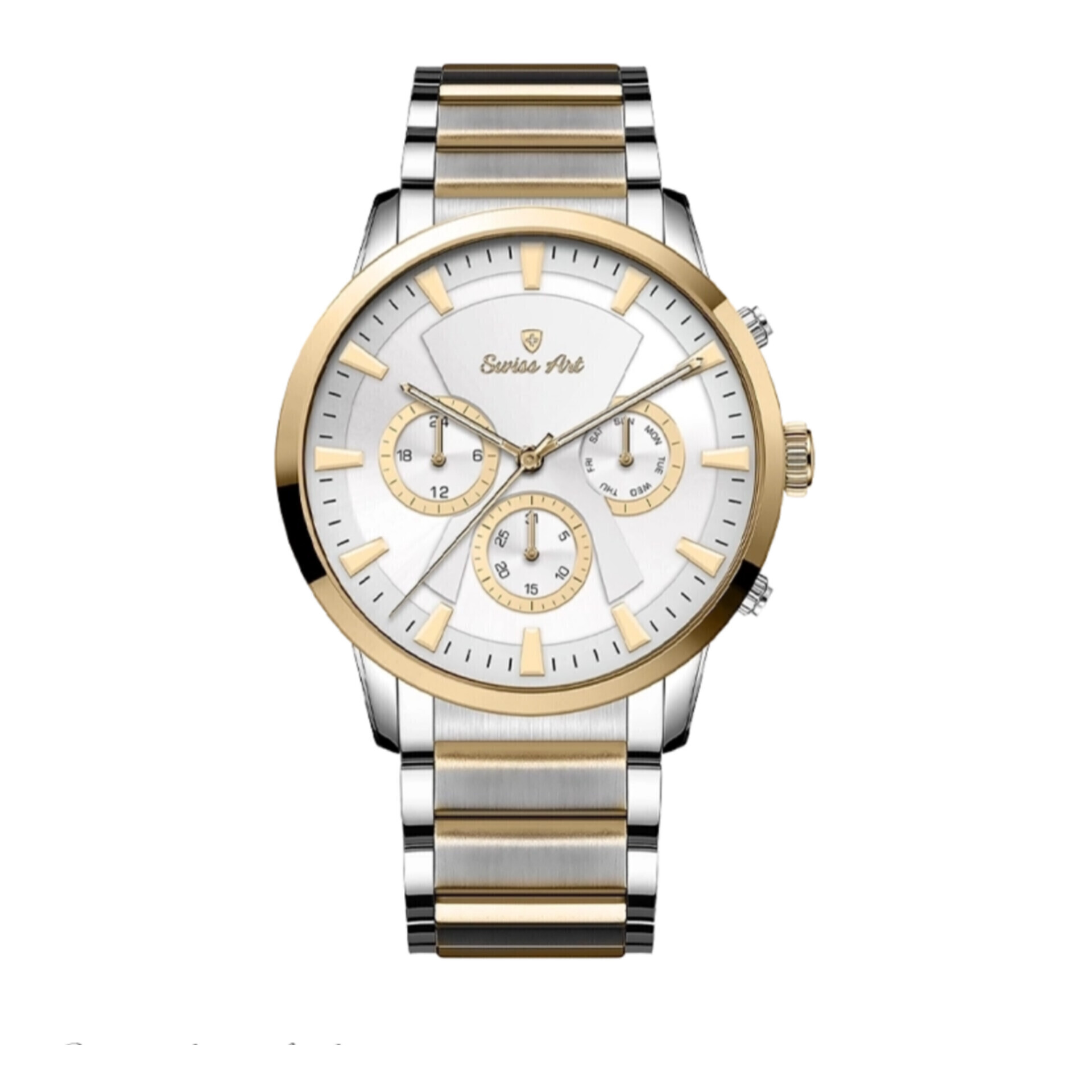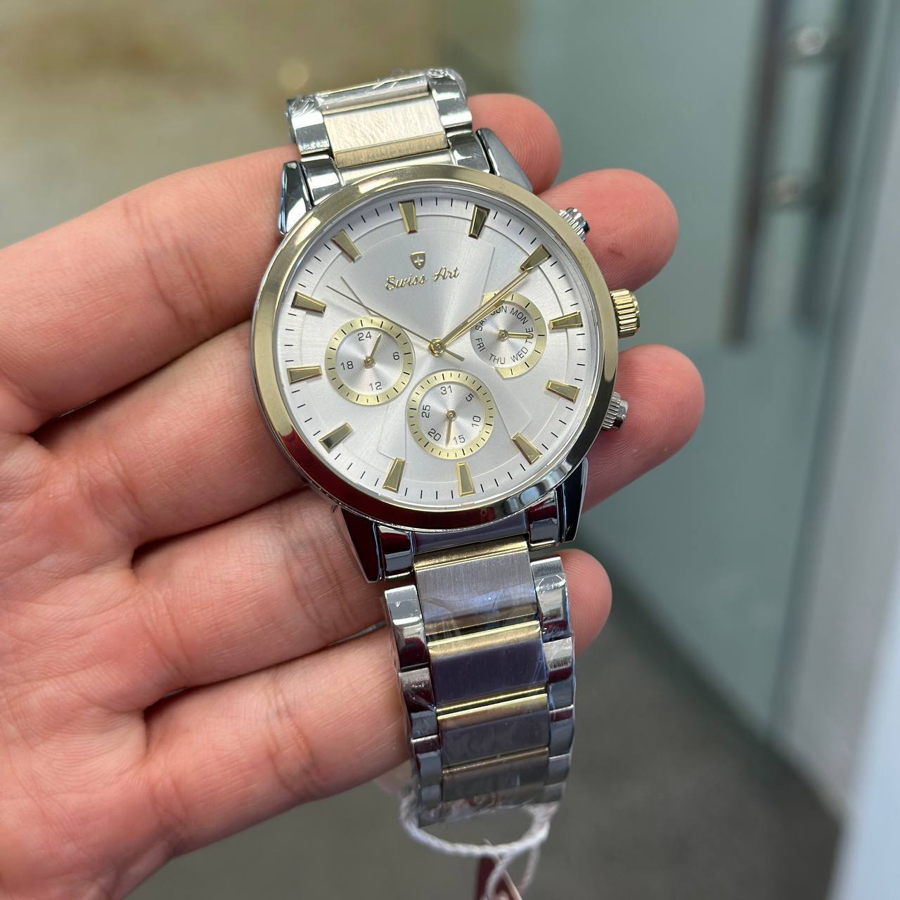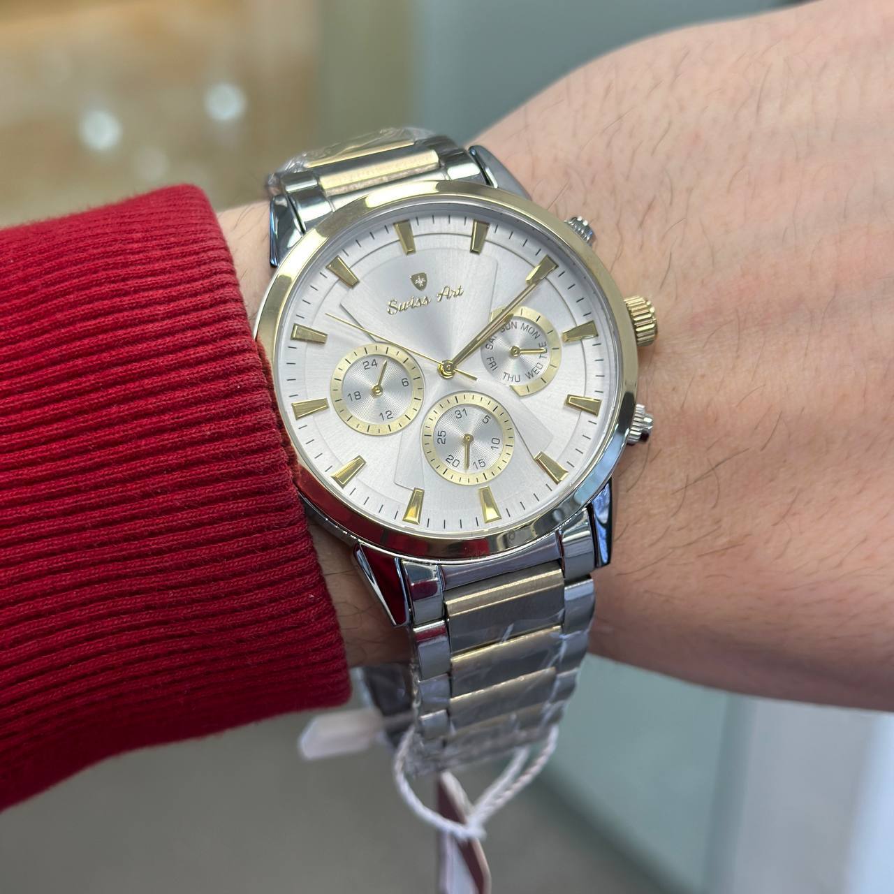 ساعت مردانه سوئیس آرت با موتور فول دیت ژاپنی میوتا، تجسمی از دقت بینظیر و طراحی لوکس است که هر لحظه را برای شما خاص و ماندگار میکند. این ساعت با قابلیت نمایش ساعت بیست و چهار ساعته، روز شمار هفته و تقویم، تمامی اطلاعات مهم زمان را به صورت جامع و دقیق در اختیار شما قرار میدهد. صفحه سفید با جزئیات طلایی و بند استیل دو رنگ طلایی و نقرهای، جلوهای از شکوه و ظرافت بینظیر را به دستان شما هدیه میکند. شیشه ضد خش سافایر، مقاومت فوقالعادهای در برابر خط و خش و ضربه دارد و بدنه کاملاً ضد آب، امکان استفاده مطمئن در هر شرایطی را فراهم میآورد. با دو سال ضمانت شرکتی و ضمانت مادامالعمر اصالت کالا، این ساعت مردانه سوئیس آرت انتخابی خاص، مطمئن و هیجانانگیز برای کسانی است که به دنبال ترکیبی از کیفیت، دوام و استایل بینظیر هستند. با این ساعت، هر لحظه از زندگی خود را با شکوه و دقتی منحصر به فرد رقم بزنید!