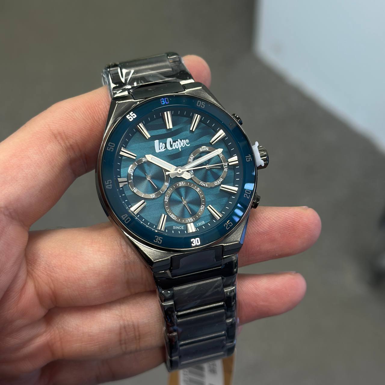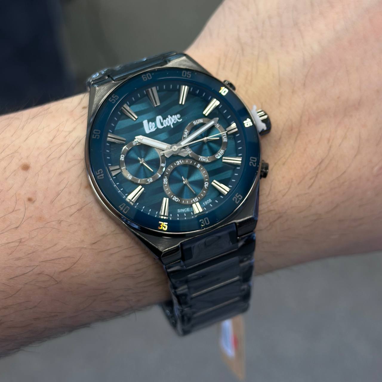 با ساعت لی کوپر مدل LC08175.090، رنگ سبز طبیعت و ابهت مشکی را یکجا هدیه دهید! این ساعت، با صفحه سبز خیرهکننده و بند و بدنه استیل مشکی، نمادی از سلیقه جسورانه شماست. هم با تیپهای اسپرت جور است، هم کلاسیک.