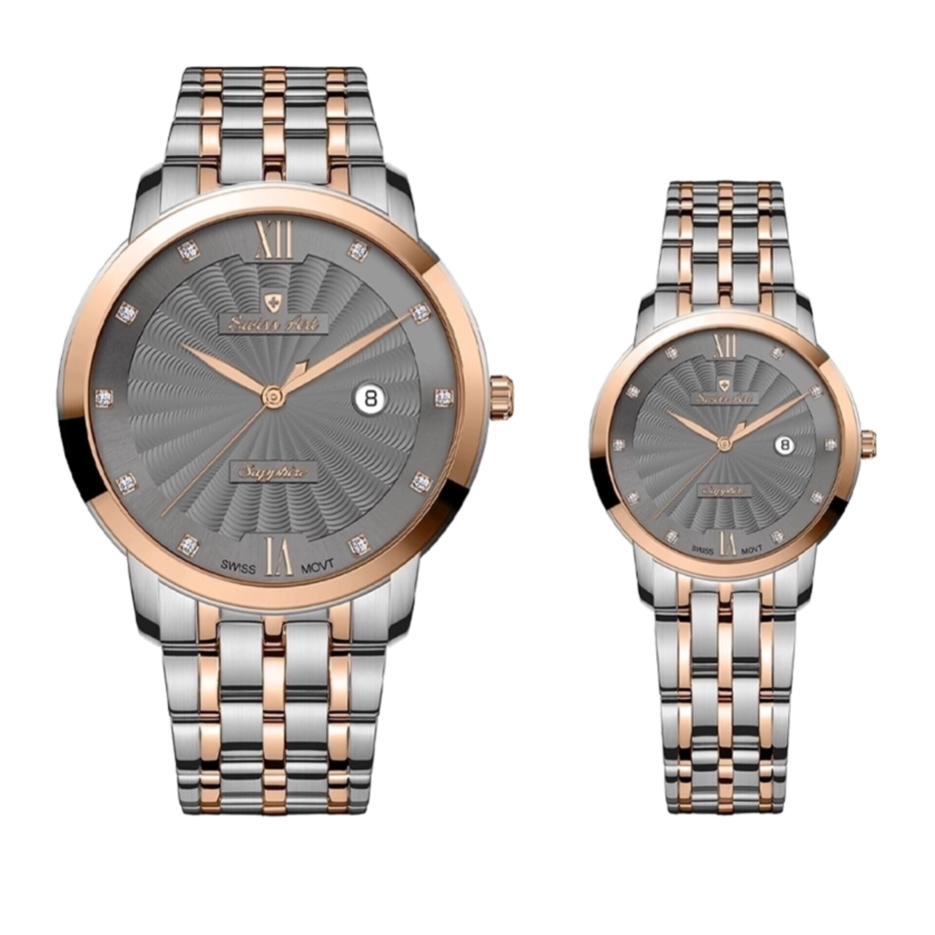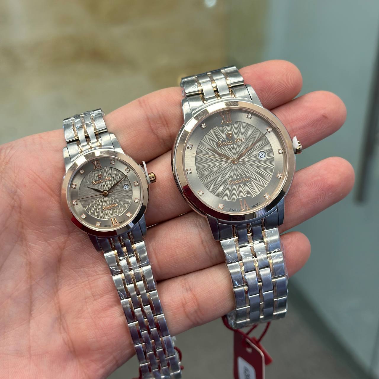 با ست شگفت‌انگیز ساعت مردانه و زنانه سوئیس آرت، جلوه‌ای بی‌نظیر و خاص به استایل خود ببخشید! این ساعت‌ها با موتور سوئیسی روندا، دقت بی‌رقیب و دوام استثنایی را تضمین می‌کنند. قابلیت نمایش تاریخ و صفحه‌ای با طراحی خیره‌کننده، همراه با شیشه ضد خش سافایر و مقاومت کامل در برابر آب، این مجموعه را به انتخابی ایده‌آل برای هر موقعیت تبدیل کرده است. با دو سال ضمانت شرکتی و تضمین مادام‌العمر اصالت کالا، خریدی مطمئن و هیجان‌انگیز را تجربه کنید و به دنیای لوکس و دقیق سوئیس آرت وارد شوید!