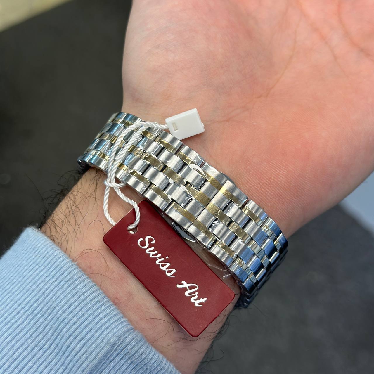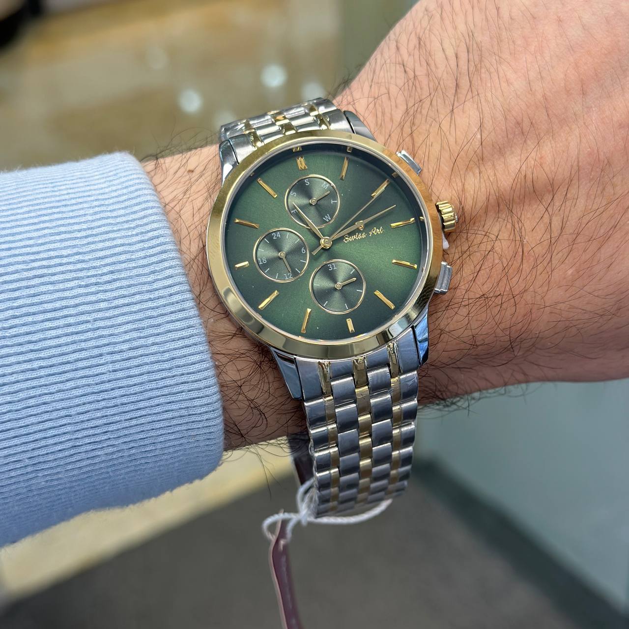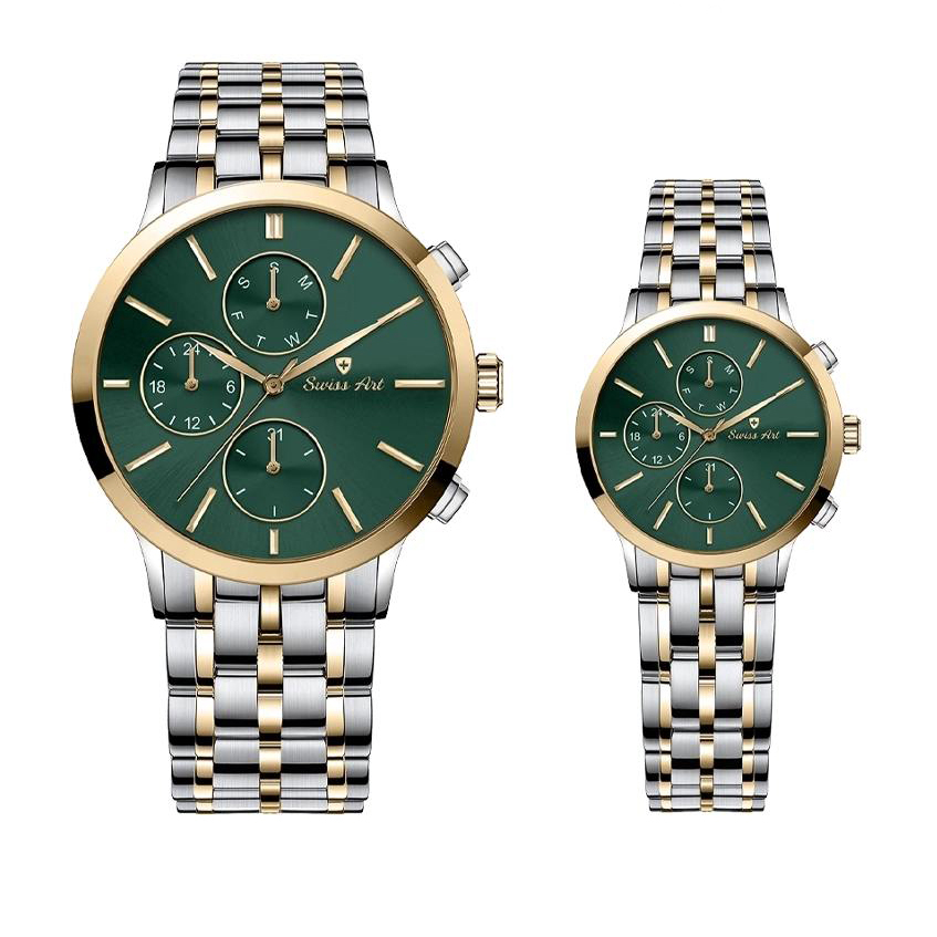ست ساعت زنانه و مردانه سوئیس آرت با موتور فول دیت ژاپنی میوتا، نمادی از هماهنگی بی‌نظیر بین ظرافت و عملکرد حرفه‌ای است که هر دو جنسیت را با طراحی شیک و مدرن خود مجذوب می‌کند. این ست منحصر به فرد با قابلیت نمایش ۲۴ ساعته، روز شمار هفته و تقویم، دقت و کاربرد را در بالاترین سطح به نمایش می‌گذارد. صفحه سبز جذاب در کنار قاب طلایی و بند دو رنگ نقره‌ای و طلایی، ترکیبی چشم‌نواز و لوکس ایجاد کرده که هر نگاه را به خود جذب می‌کند. شیشه ضد خش سافایر مقاوم، حفاظت کامل از صفحه را تضمین می‌کند و ویژگی ضد آب بودن، امکان استفاده راحت و بدون دغدغه در شرایط مختلف را فراهم می‌آورد. با دوسال ضمانت شرکتی و ضمانت مادام العمر اصالت کالا، این ست ساعت سوئیس آرت نه تنها تضمینی برای کیفیت و اصالت است بلکه انتخابی وسوسه‌انگیز و هیجان‌انگیز برای کسانی است که به دنبال بهترین‌ها در استایل و کارایی هستند. اگر می‌خواهید یک جفت ساعت با همسرتان یا عزیزانتان داشته باشید که هم خاص باشد و هم شیک، این ست فوق‌العاده سوئیس آرت بهترین گزینه است!