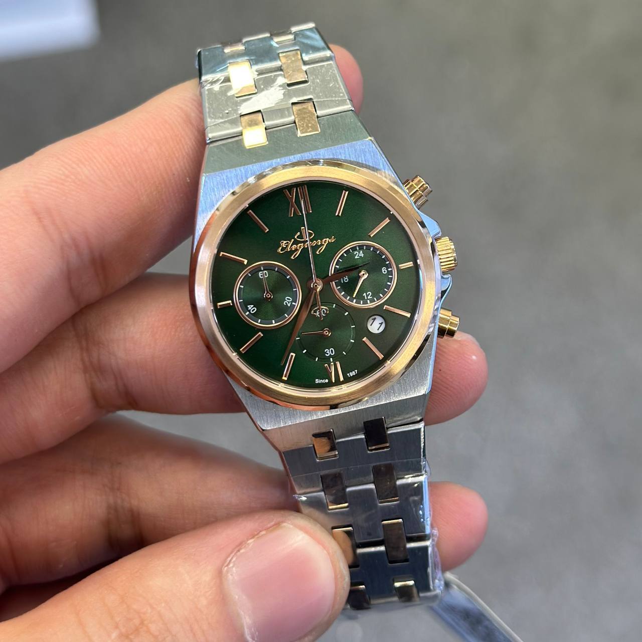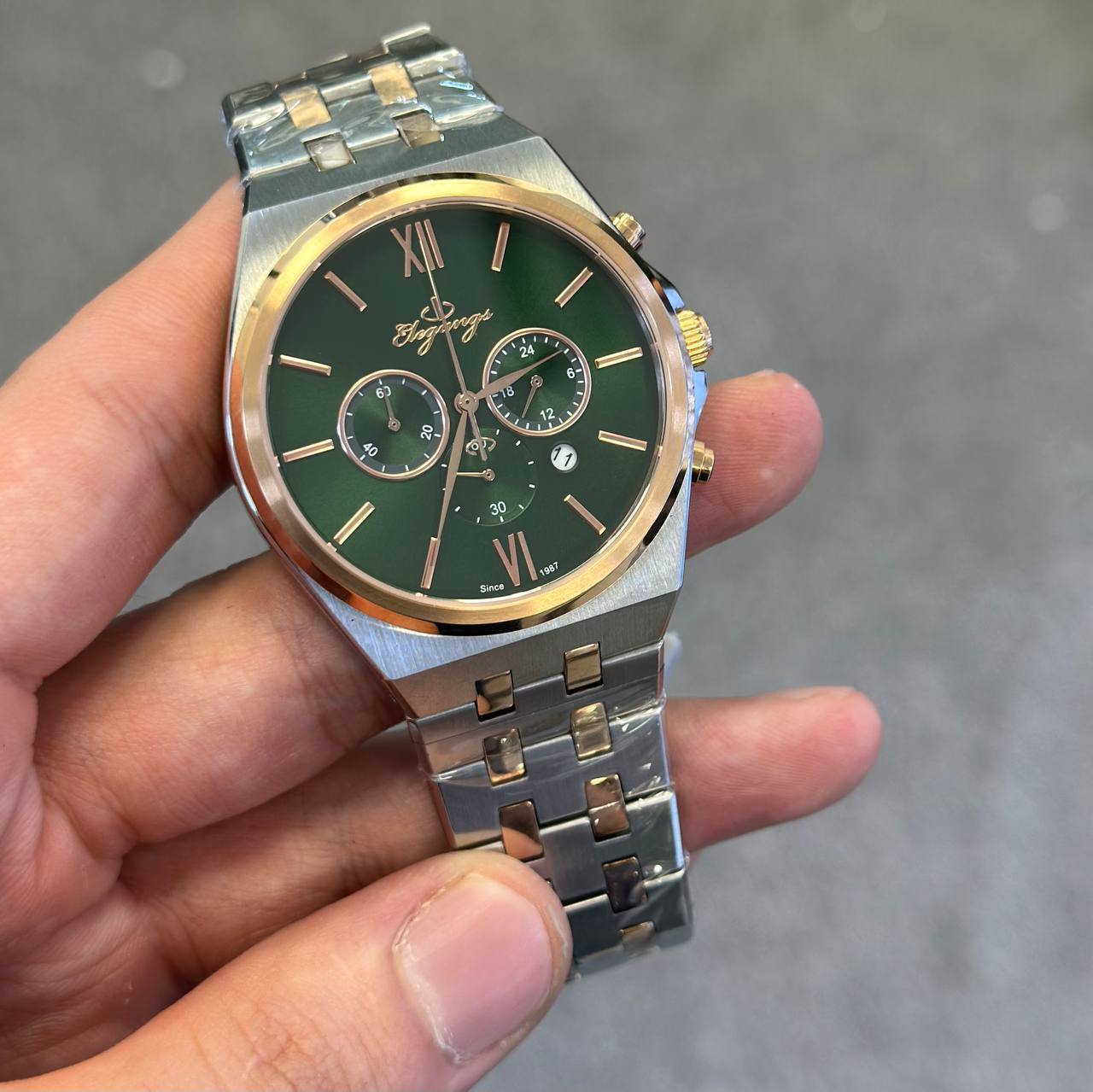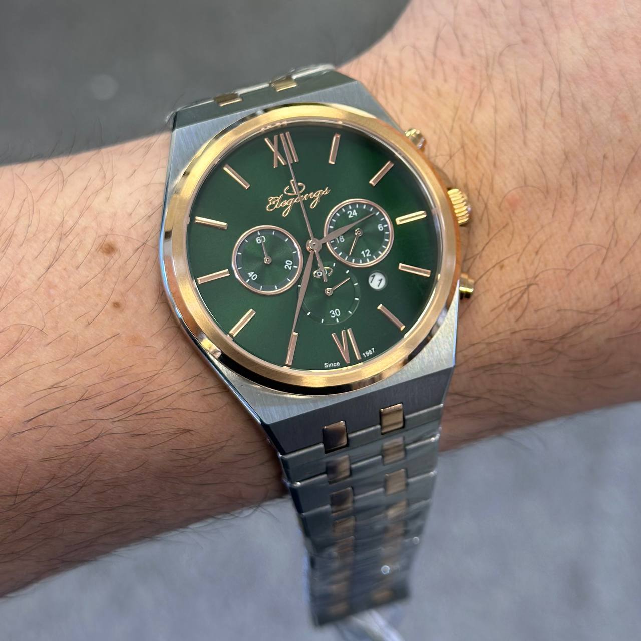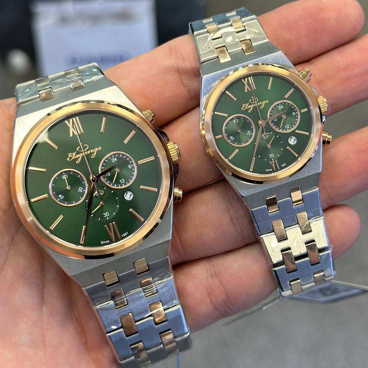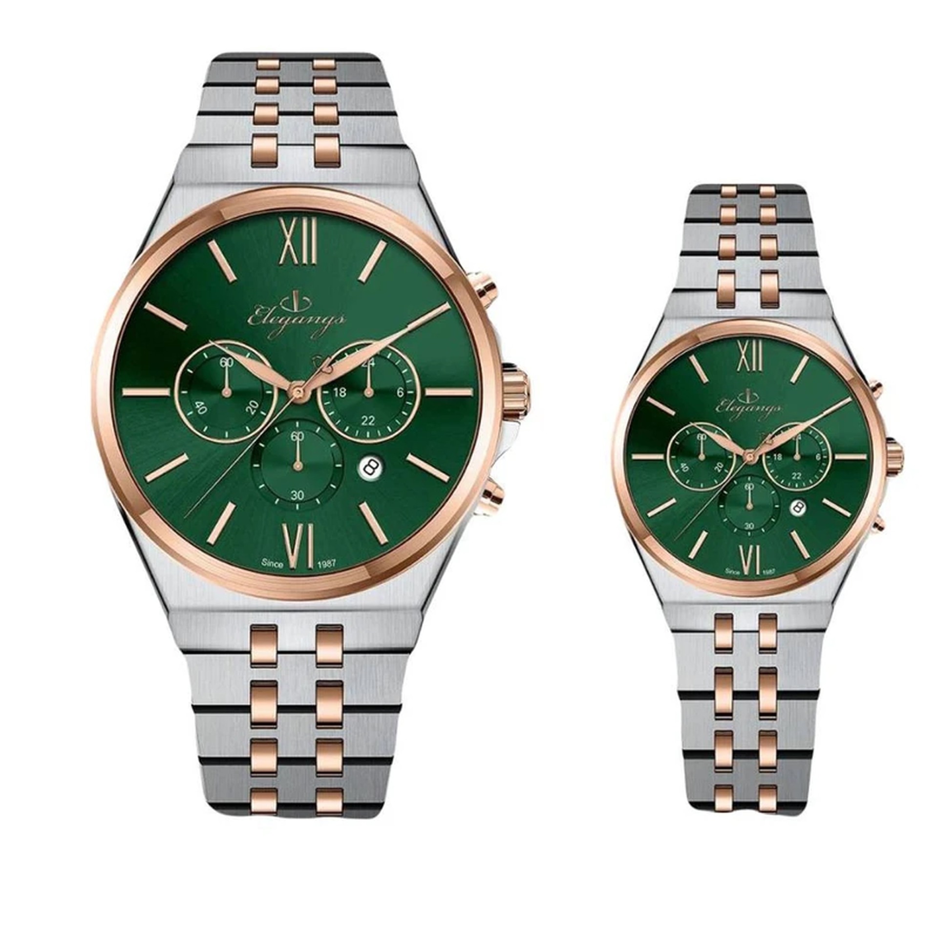 ست ساعت مچی مردانه و زنانه برند الگنگس (Elegangs) با صفحه سبز چشمنواز و طراحی لوکس، انتخابی ایدهآل برای زوجهایی است که به استایل متفاوت و هماهنگ اهمیت میدهند. این ست با بهرهگیری از موتور ژاپنی میوتا کرنوگراف، دقت و کارایی را در کنار زیبایی ارائه میدهد. بند استیل مقاوم، شیشه ضد خش سافایر و قابلیت ضد آب، آن را به گزینهای بادوام و ماندگار تبدیل کرده است. همراه با دو سال ضمانت شرکتی و ضمانت مادامالعمر اصالت کالا، این ست نمادی از کیفیت، ظرافت و اعتماد برای موقعیتهای خاص یا هدیهای ماندگار است.
