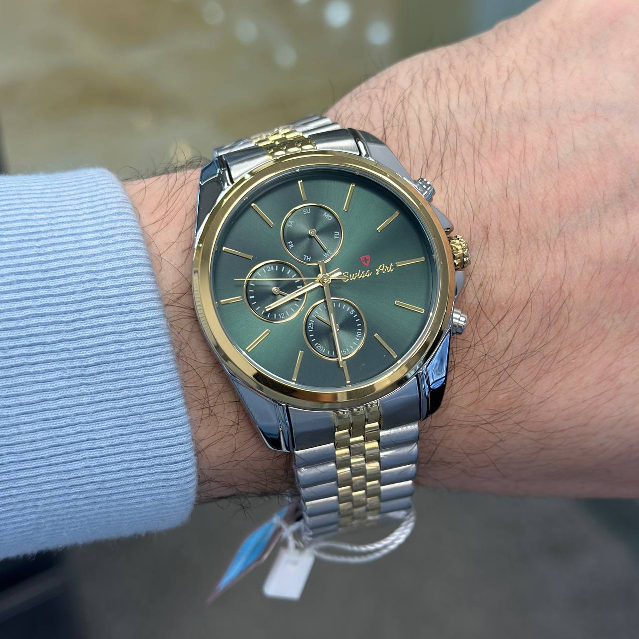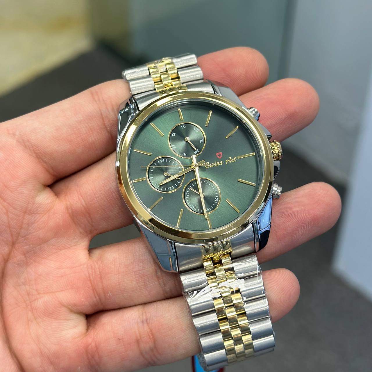 ساعت مردانه سوئیس آرت با طراحی برجسته و ویژگیهای پیشرفته، انتخابی ایدهآل برای کسانی است که به دقت، کیفیت و استایل اهمیت میدهند. این ساعت با موتور فول دیت ژاپنی، قابلیت نمایش ساعت 24 ساعته، روز شماره هفته و تقویم را به شما میدهد که علاوه بر دقت بالا، کاربری راحتی را نیز فراهم میکند. طراحی صفحه سبز و ترکیب بند استیل نقرهای و طلایی، ظاهری شیک و مدرن به این ساعت بخشیده است. شیشه ضد خش سافایر از آسیبها جلوگیری میکند و طول عمر ساعت را تضمین میکند. این ساعت ضد آب بوده و در شرایط مختلف قابل استفاده است. با دو سال ضمانت شرکتی و ضمانت مادامالعمر اصالت کالا، شما میتوانید با اطمینان از خرید خود لذت ببرید. همین حالا این ساعت لوکس را از فروشگاه ما تهیه کنید و از دقت و طراحی بینظیر آن بهرهمند شوید!