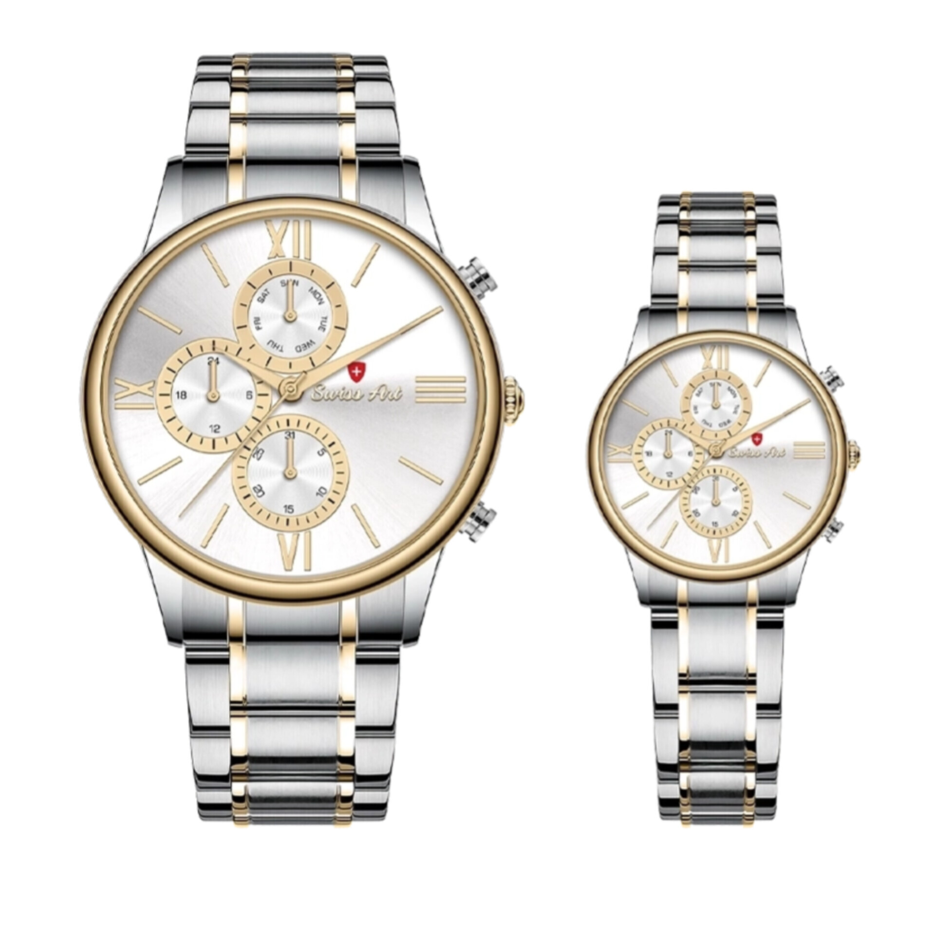 ست ساعت مردانه و زنانه سوئیس آرت با صفحه صدفی خیره‌کننده و بند استیل براق، نمادی از هماهنگی، ظرافت و کیفیت است که هر زوج خوش‌سلیقه‌ای را مجذوب خود می‌کند. این ست منحصربه‌فرد با بهره‌گیری از موتور حرفه‌ای فول دیت ژاپنی میوتا، قابلیت نمایش دقیق ساعت ۲۴ ساعته، روز هفته، تاریخ و تقویم را فراهم می‌سازد. شیشه‌ی سافایر ضد خش و طراحی ضد آب، محافظت و دوام بی‌نقص این ساعت‌ها را در هر موقعیتی تضمین می‌کند. ترکیب طراحی ظریف و عملکرد دقیق، این ست را به انتخابی ممتاز برای هدیه یا همراهی روزمره تبدیل کرده است. همراه با دو سال ضمانت شرکتی و ضمانت مادام‌العمر اصالت کالا، این ساعت‌ها فقط زمان را نشان نمی‌دهند، بلکه استایل و شخصیت شما را به نمایش می‌گذارند.