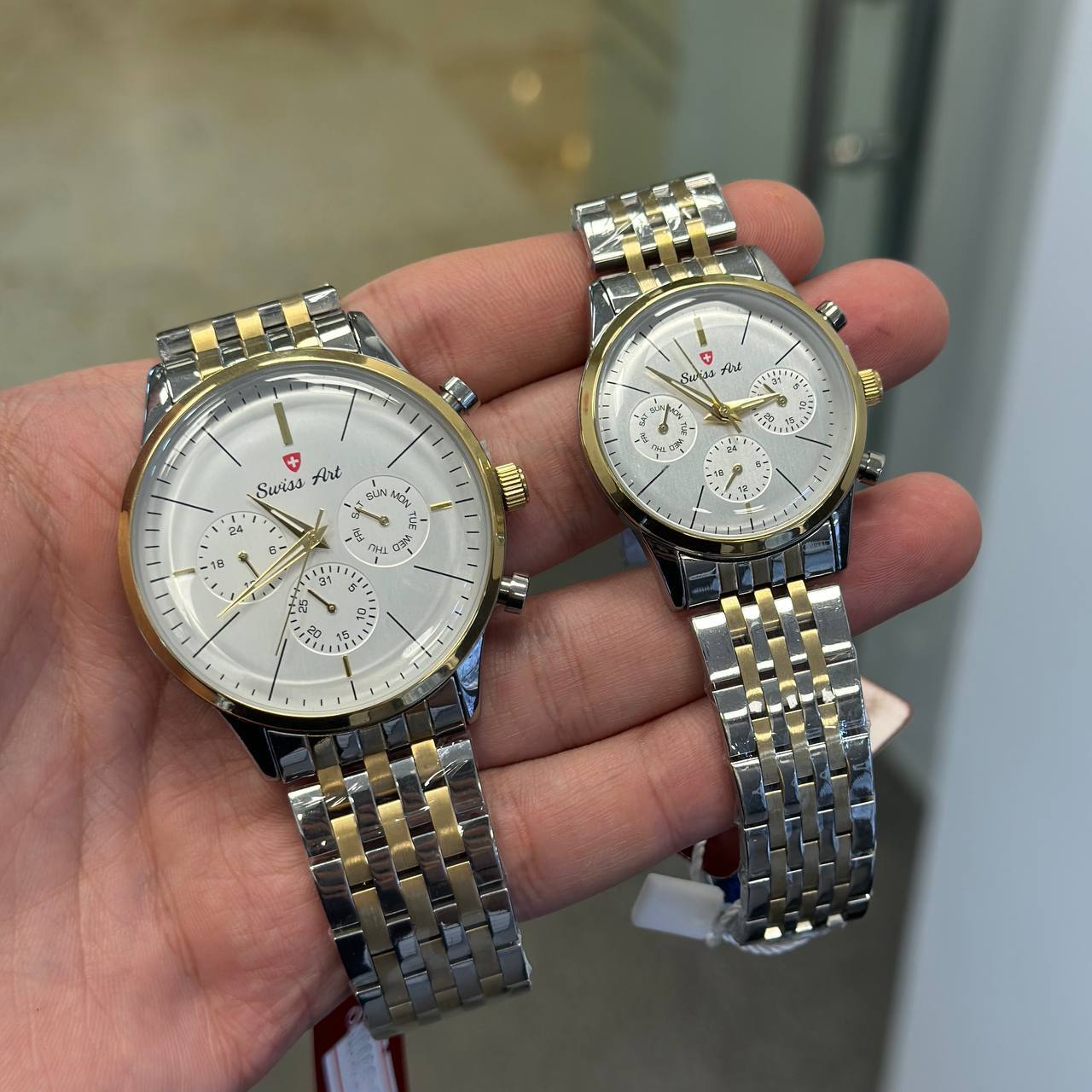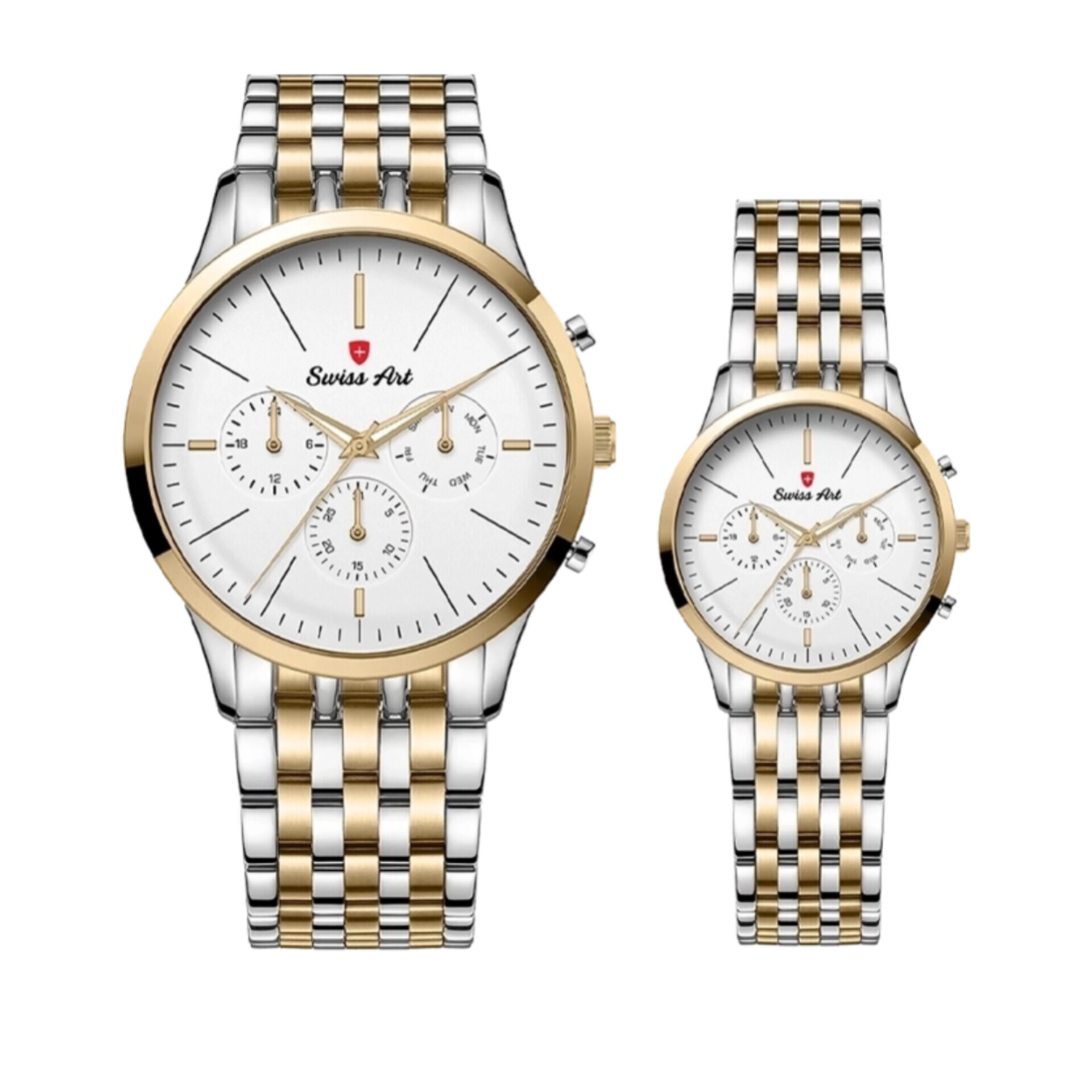 ست ساعت مردانه و زنانه سوئیس آرت با موتور فول دیت ژاپنی میوتا، ترکیبی بینظیر از ظرافت، دقت و کارایی است که هر لحظه را برای شما خاص و خاطرهانگیز میکند. این مجموعه با قابلیت نمایش ساعت بیست و چهار ساعته، روز شمار هفته و تقویم، تمامی اطلاعات زمان را به صورت دقیق و جامع در اختیار شما قرار میدهد. صفحه سفید با جزئیات طلایی و بند استیل دو رنگ طلایی و نقرهای، جلوهای از شکوه و استحکام را به دستان شما هدیه میدهد. شیشه ضد خش سافایر، مقاومت فوقالعادهای در برابر خط و خش و ضربه دارد و بدنه کاملاً ضد آب، امکان استفاده مطمئن در هر شرایطی را فراهم میآورد. با دو سال ضمانت شرکتی و ضمانت مادامالعمر اصالت کالا، این ست خاص سوئیس آرت، انتخابی مطمئن، هیجانانگیز و خاص برای کسانی است که به دنبال ترکیبی از کیفیت، دوام و استایل بینظیر هستند. با سوئیس آرت، هر لحظه زندگی خود را به فرصتی برای درخشش و جذابیت تبدیل کنید!