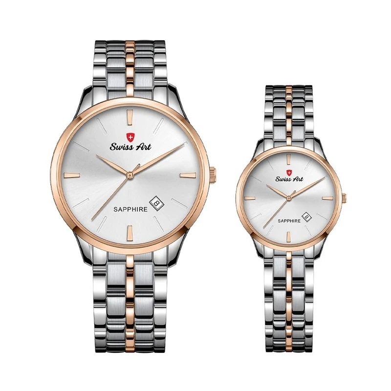 ست ساعت زنانه و مردانه سوئیس آرت با موتور ژاپنی دقیق و قابل اعتماد، نمادی از هماهنگی بی‌نظیر طراحی کلاسیک و فناوری پیشرفته است که هر زوجی را به بهترین شکل همراهی می‌کند. این ست زیبا با قابلیت نمایش تاریخ، ضمن افزودن جلوه‌ای کاربردی و مدرن به استایل شما، دارای شیشه ضد خش سافایر است که مقاومت بالا در برابر خط و خش و ضربه را تضمین می‌کند. ویژگی ضد آب بودن، امکان استفاده راحت و بدون دغدغه در تمامی شرایط محیطی را فراهم می‌آورد. ترکیب رنگ نقره‌ای و رزگلد در بند استیل این ست، جلوه‌ای لوکس و ماندگار به آن بخشیده است که هر نگاه را به خود جذب می‌کند. با دوسال ضمانت شرکتی و ضمانت مادام العمر اصالت کالا، این ست ساعت سوئیس آرت تضمینی برای کیفیت، دوام و اصالت برند است و انتخابی وسوسه‌انگیز و خاص برای تکمیل استایل روزمره یا هدیه‌ای بی‌نظیر به عزیزانتان محسوب می‌شود. اگر به دنبال یک جفت ساعت زیبا، با دوام و متفاوت هستید، این ست جذاب سوئیس آرت بهترین گزینه برای شماست!