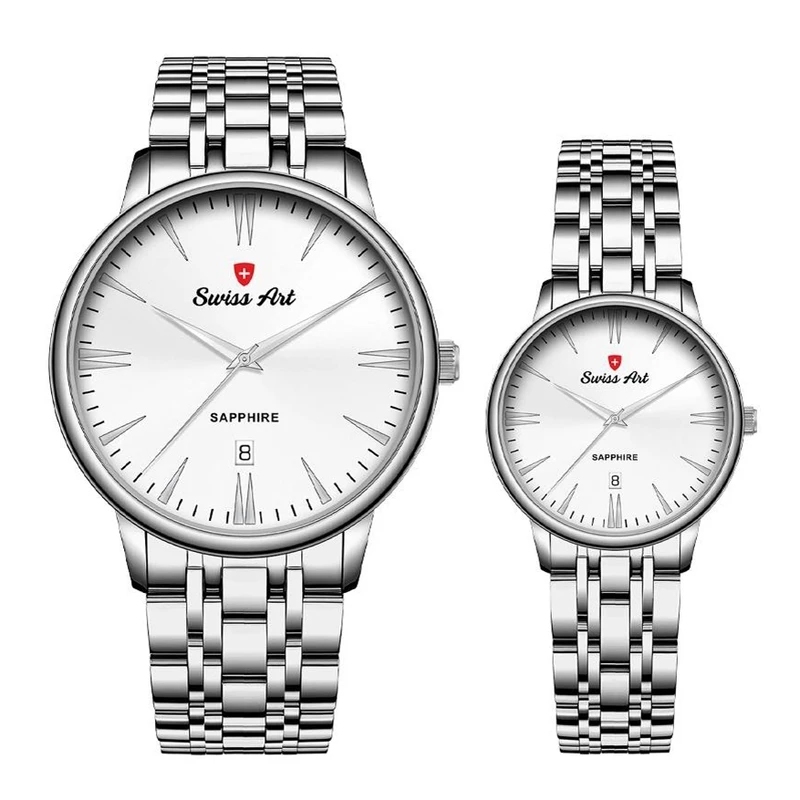 ست ساعت زنانه و مردانه سوئیس آرت با موتور ژاپنی دقیق و قابل اعتماد، نمادی از هماهنگی بی‌نظیر طراحی کلاسیک و فناوری پیشرفته است که هر زوجی را در تکمیل استایل‌شان همراهی می‌کند. این ست شیک با قابلیت نمایش تاریخ، ضمن افزودن جلوه‌ای کاربردی و مدرن، مجهز به شیشه ضد خش سافایر است که مقاومت بالا در برابر خط و خش و ضربه را تضمین می‌کند. ویژگی ضد آب بودن آن، امکان استفاده آسان و بدون نگرانی در شرایط مختلف را فراهم می‌آورد. بند استیل نقره‌ای با طراحی ظریف و کلاسیک، جلوه‌ای لوکس و ماندگار به این ست بخشیده است که هر نگاه را به خود جذب می‌کند. با دوسال ضمانت شرکتی و ضمانت مادام العمر اصالت کالا، این ست ساعت سوئیس آرت تضمینی برای کیفیت، دوام و اصالت برند است و انتخابی هیجان‌انگیز، خاص و وسوسه‌کننده برای تکمیل استایل روزمره یا هدیه‌ای ماندگار به عزیزانتان محسوب می‌شود. اگر به دنبال یک جفت ساعت زیبا، مقاوم و متفاوت هستید، این ست جذاب سوئیس آرت بهترین گزینه برای شماست!